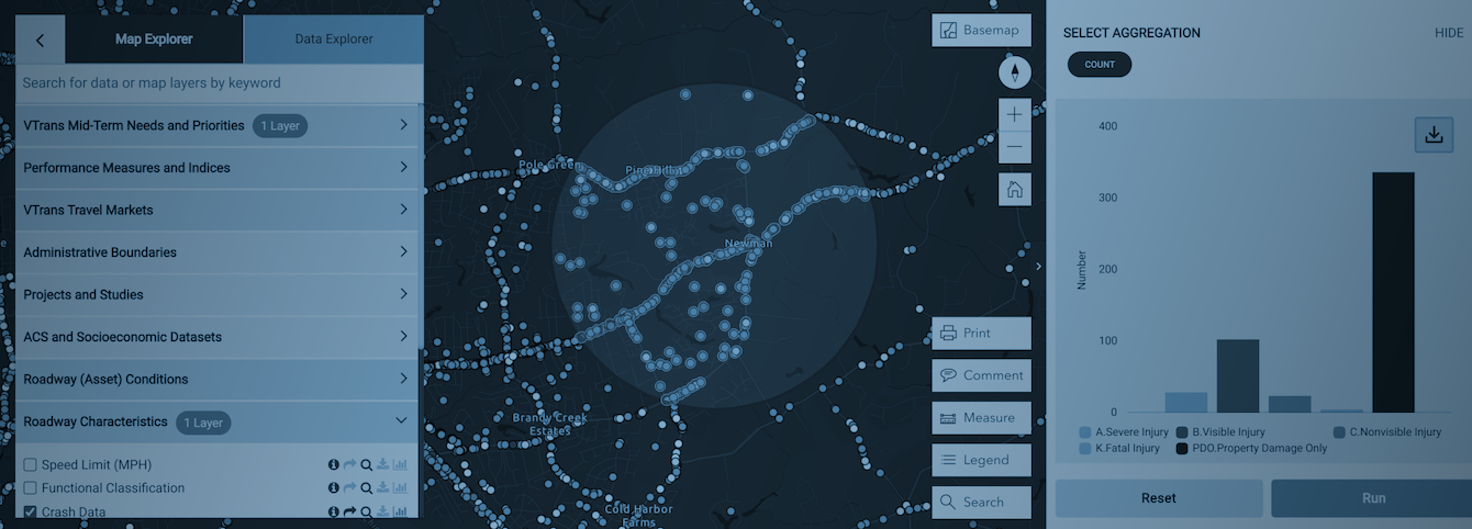 MapExplorer is VTran’s map-based application for viewing and downloading location-specific information, generating statistical graphs based on spatial data, and sharing map views. Below you will find a quick start guide and video tutorial explaining how to use MapExplorer.Quick Start Guide